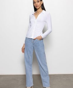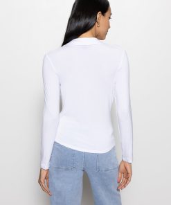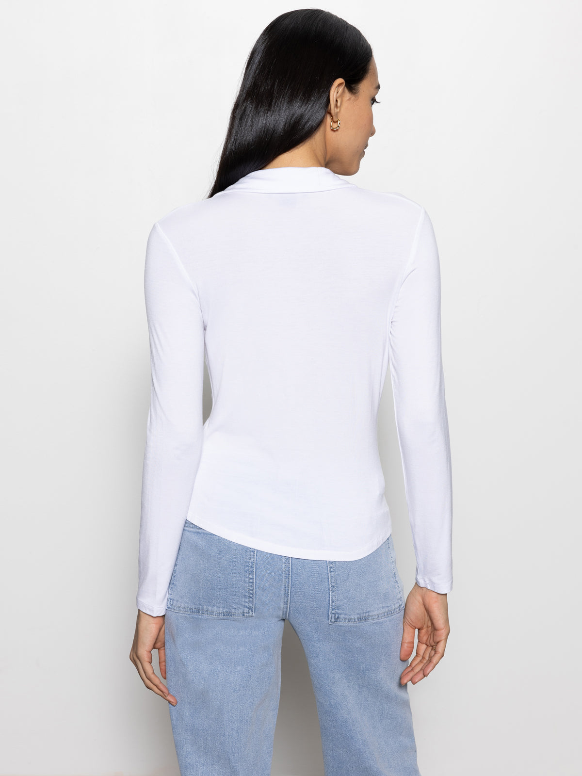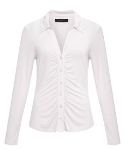 A lightweight slinky knit shapes this slim button-front blouse finished with a deep V and ruched front detail.