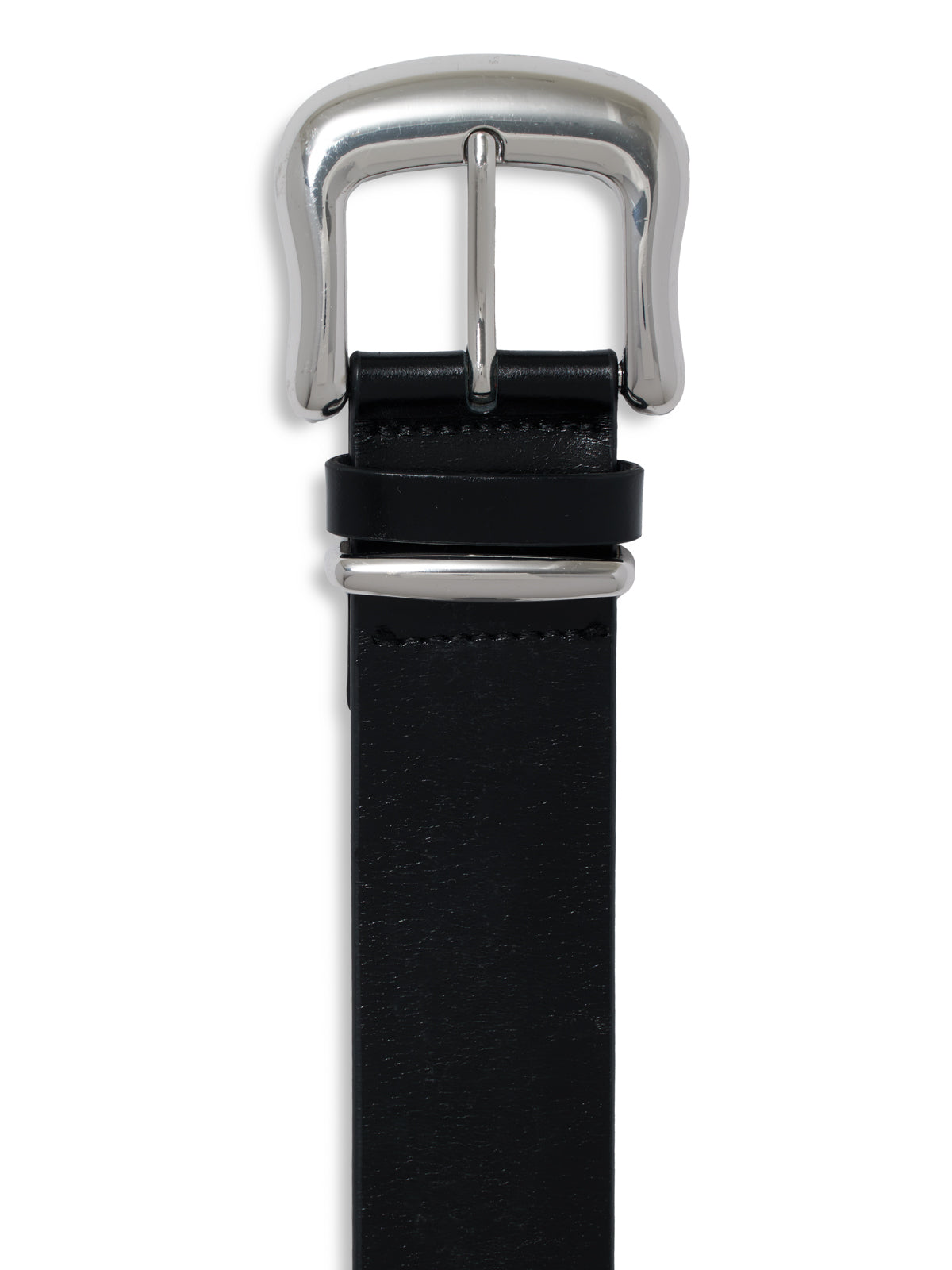- The Rowan Belt Black by Sanctuary Clothing is a black leather belt with a shiny silver buckle.